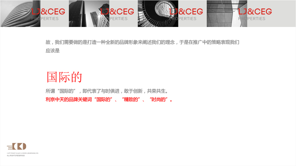 故,我们需要做的是打造一种全新的品牌形象来阐述我们的理念,于是在推广中的策略表现我们应该是国际的所谓“国际的”,即代表了与时俱进,敢于创新,共荣共生。利京中天的品牌关键词“国际的”、“精致的”、“时尚的”。