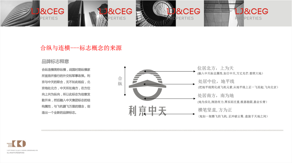合纵连横简称纵横,战国时期纵横家所宣扬并推行的外交和军事政策。利京与中天的联合,无不如此相应,北京地处北方,中天所处南方,在方位向上共为纵向,所以此标志为创意发散开来,然后融入中天集团标志的结构属性,与飞机鹏飞万里的理念,创造出一个全新的品牌标志。