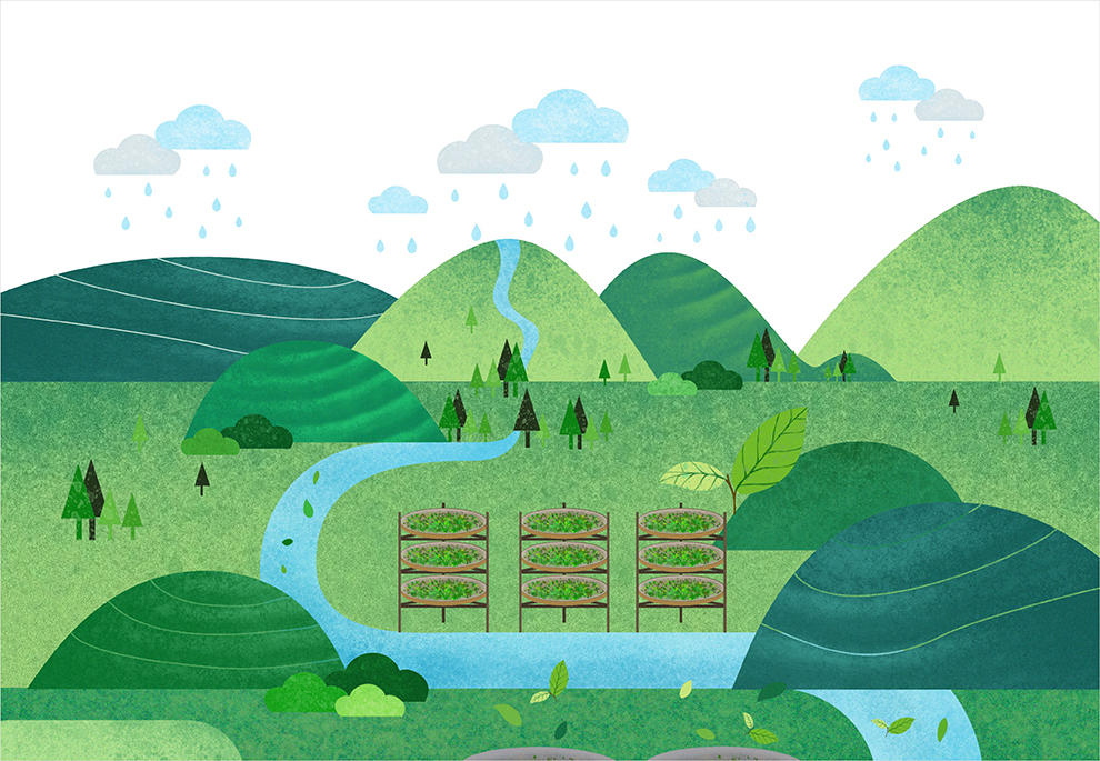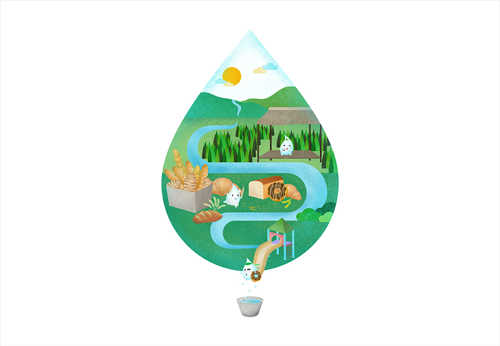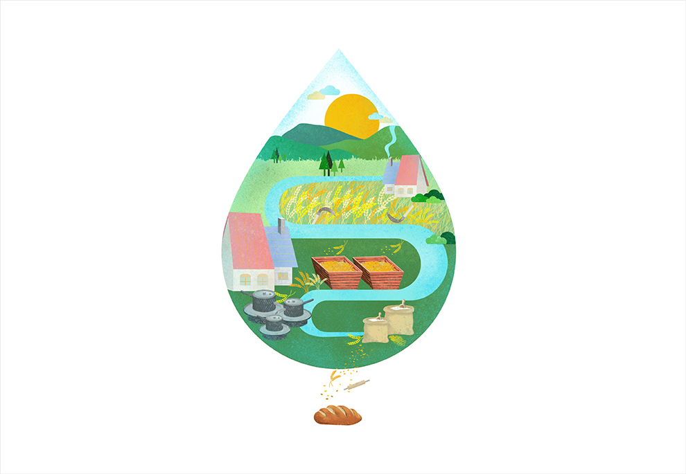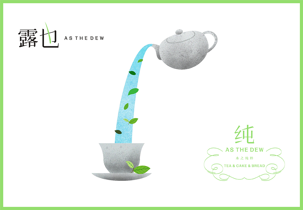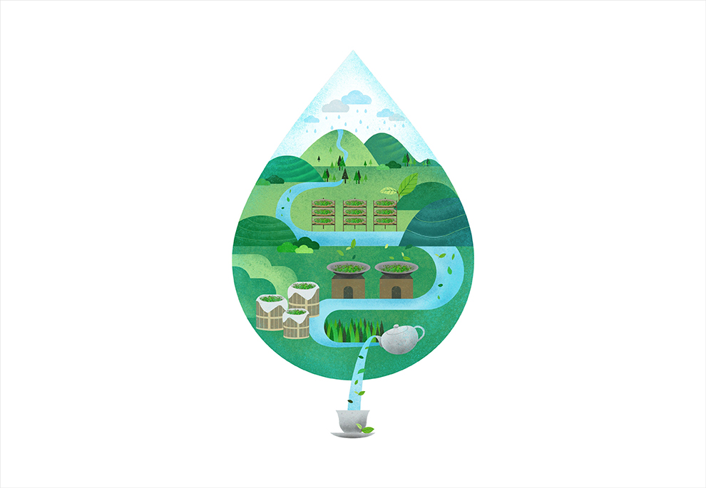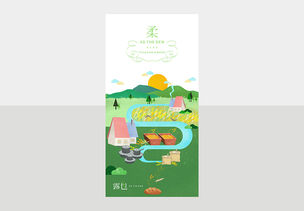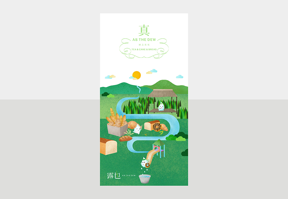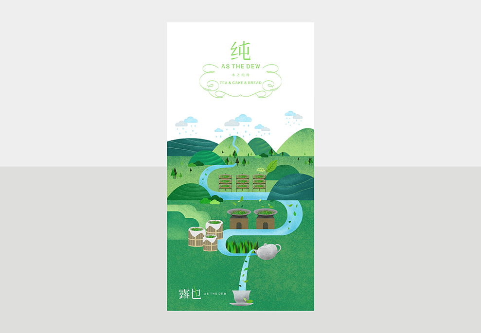我们分别以:水之纯,纯水的形成之旅;面之柔,面粉的形成之旅;材之真,茶叶的形成之旅。来创作插图,融入至品牌风格之中。