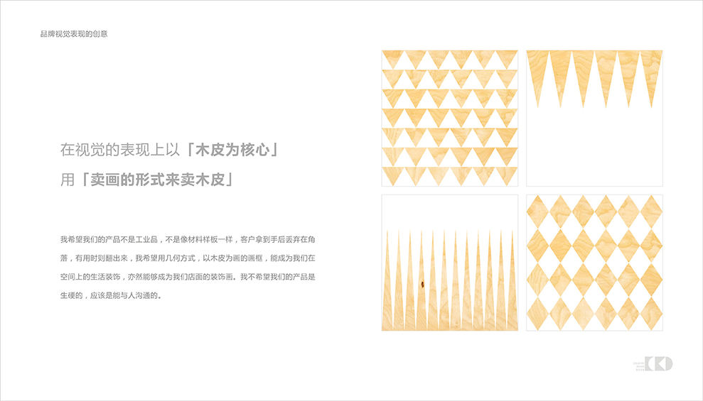 在视觉的表现上以「木皮为核心」,用「卖画的形式来卖木皮」