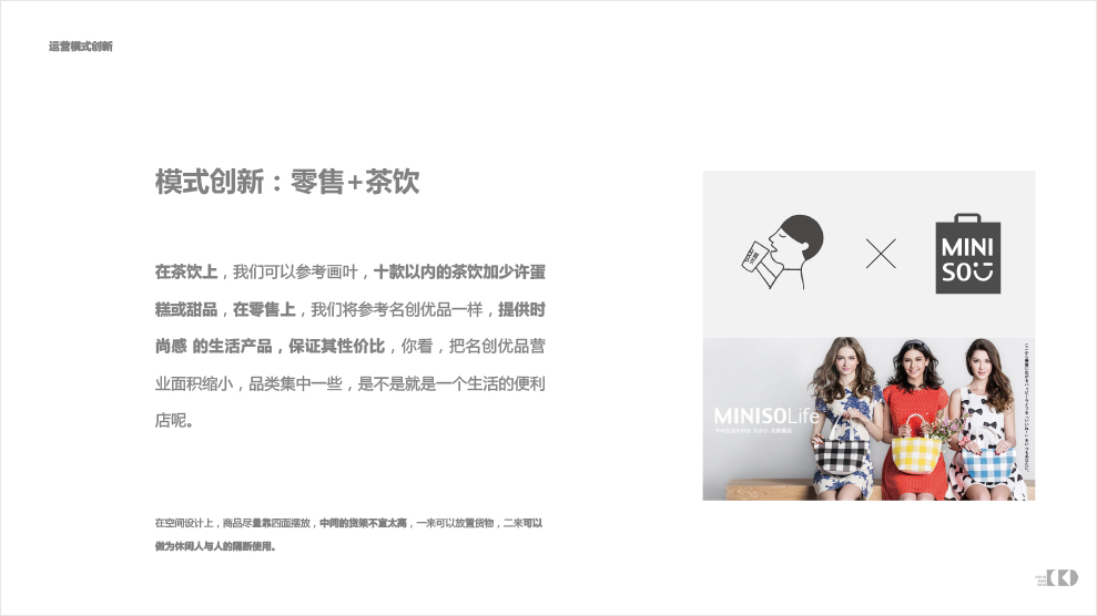 喜茶、微咖、画叶、85℃……为什么成为时尚九零后打卡圣地,作为未来消费90,00后的消费主场,相比高性价比的消费,一个极具网红的品牌设计空间,便能让消费者花上数十元,坐上半小时与朋友的欢乐畅聊,或者打王者荣耀,度过美好的时光。在茶饮上,我们可以参考画叶,十款以内的茶饮加少许蛋糕或甜品,在零售上,我们将参考名创优品一样,提供时尚感 的生活产品,保证其性价比,你看,把名创优品营业面积缩小,品类集中一些,是不是就是一个生活的便利店呢。