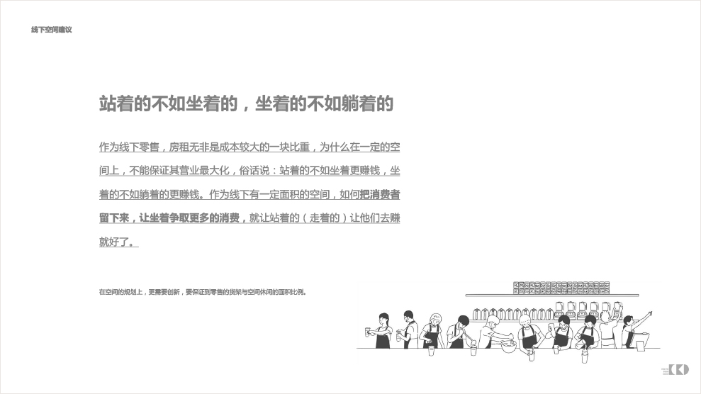 作为线下零售,房租无非是成本较大的一块比重,为什么在一定的空间上,不能保证其营业最大化,俗话说:站着的不如坐着更赚钱,坐着的不如躺着的更赚钱。作为线下有一定面积的空间,如何把消费者留下来,让坐着争取更多的消费,就让站着的(走着的)让他们去赚就好了。