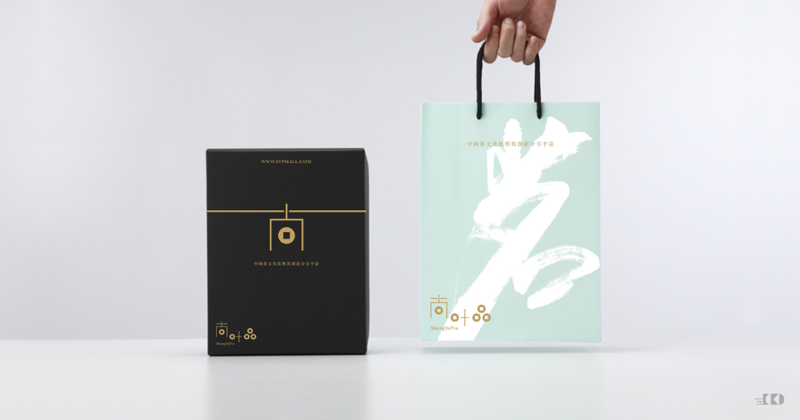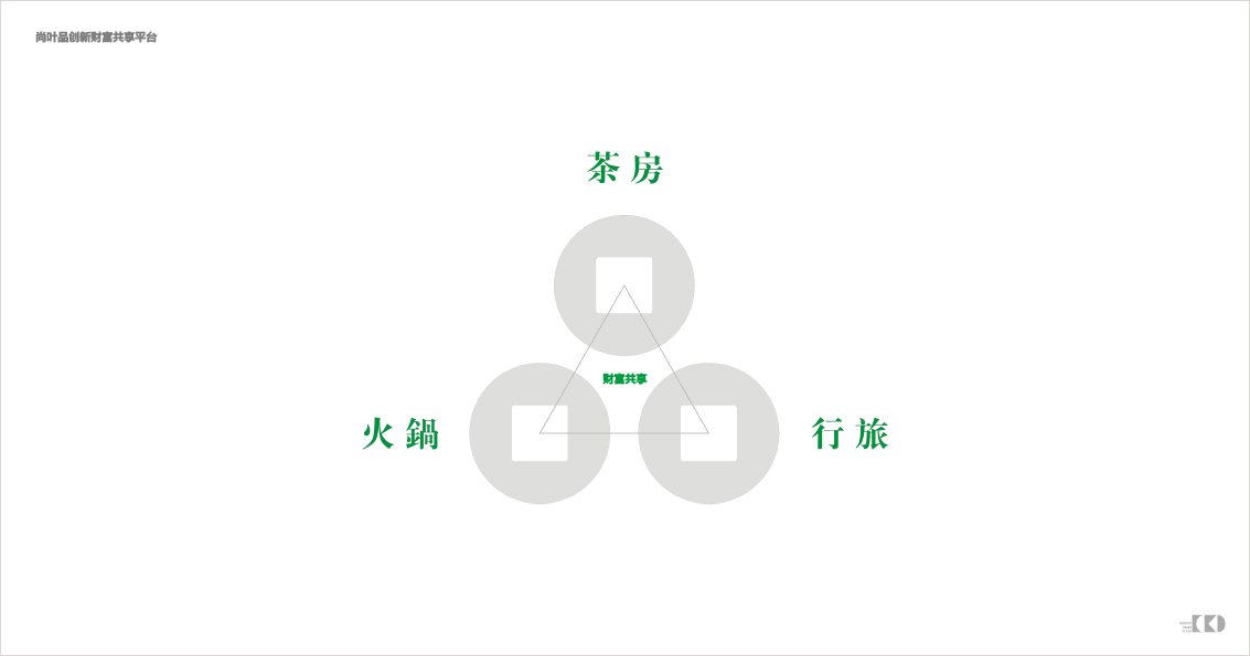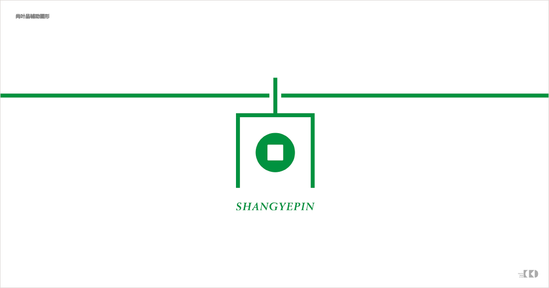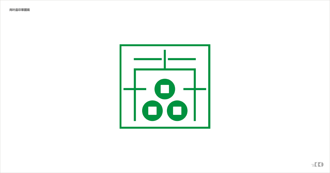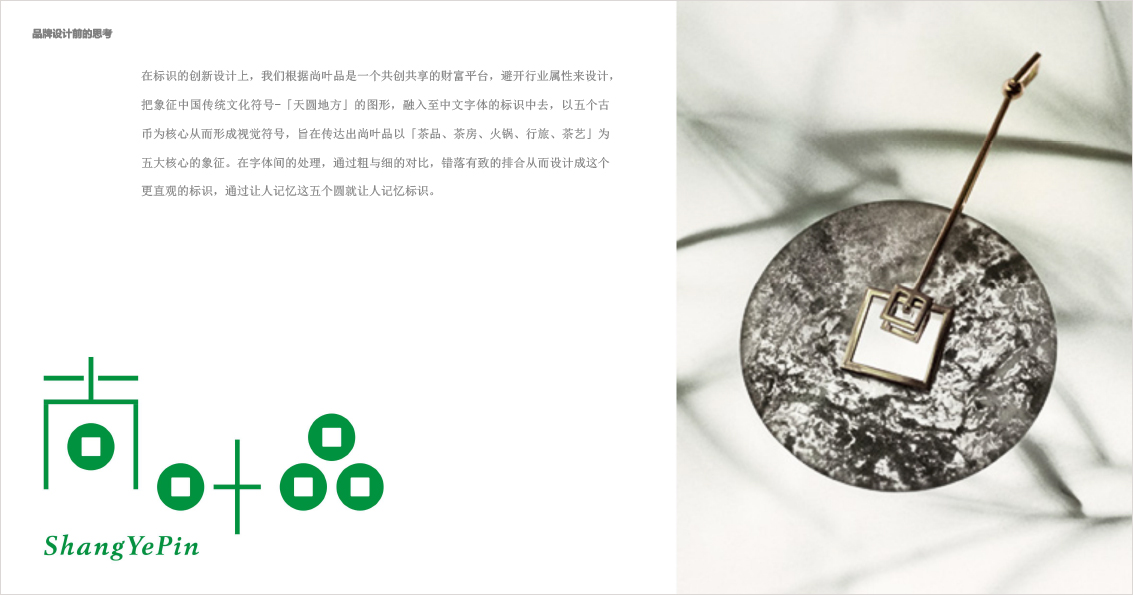 在标识的创新设计上,我们根据尚叶品是一个共创共享的财富平台,避开行业属性来设计,把象征中国传统文化符号-「天圆地方」的图形,融入至中文字体的标识中去,以五个古币为核心从而形成视觉符号,旨在传达出尚叶品以「茶品、茶房、火锅、行旅、茶艺」为五大核心的象征。在字体间的处理,通过粗与细的对比,错落有致的排合从而设计成这个更直观的标识,通过让人记忆这五个圆就让人记忆标识。