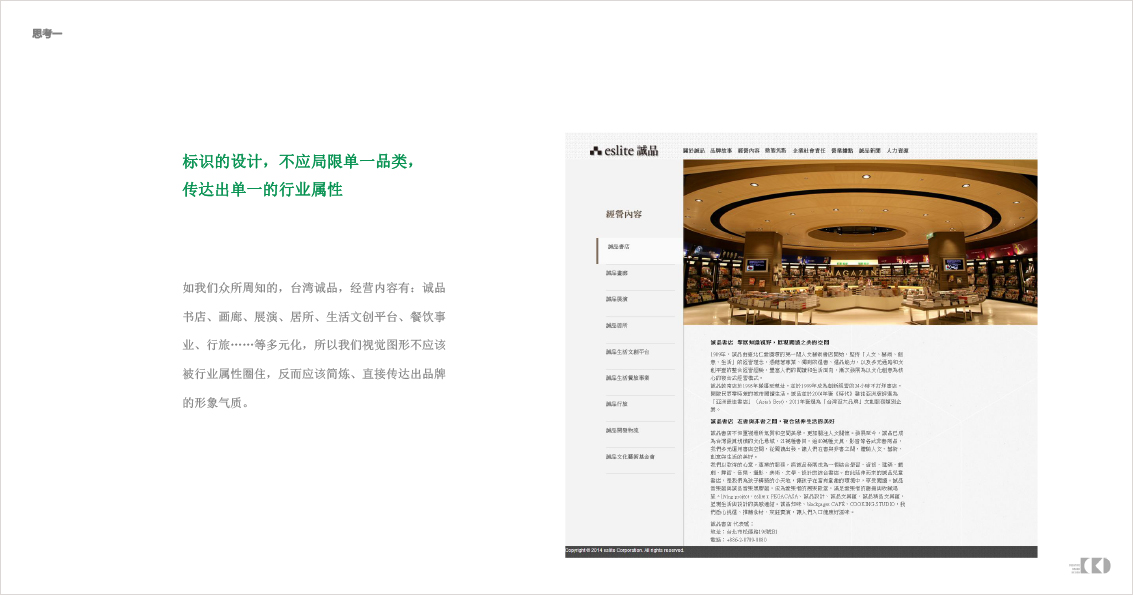 如我们众所周知的,台湾诚品,经营内容有:诚品书店、画廊、展演、居所、生活文创平台、餐饮事业、行旅……等多元化,所以我们视觉图形不应该被行业属性圈住,反而应该简炼、直接传达出品牌的形象气质。