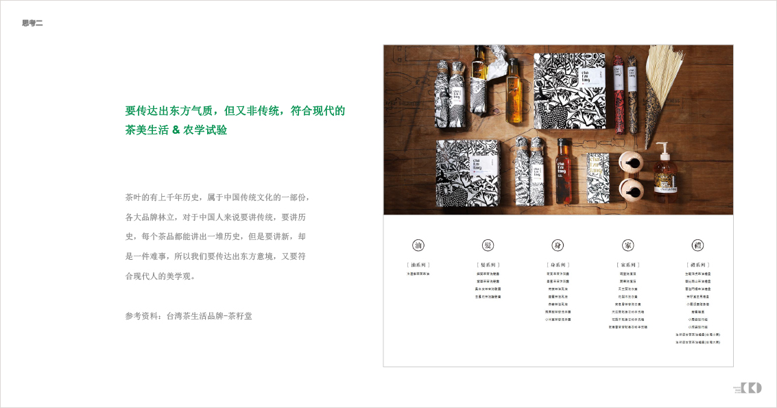 茶叶的有上千年历史,属于中国传统文化的一部份,各大品牌林立,对于中国人来说要讲传统,要讲历史,每个茶品都能讲出一堆历史,但是要讲新,却是一件难事,所以我们要传达出东方意境,又要符合现代人的美学观。参考资料:台湾茶生活品牌-茶籽堂