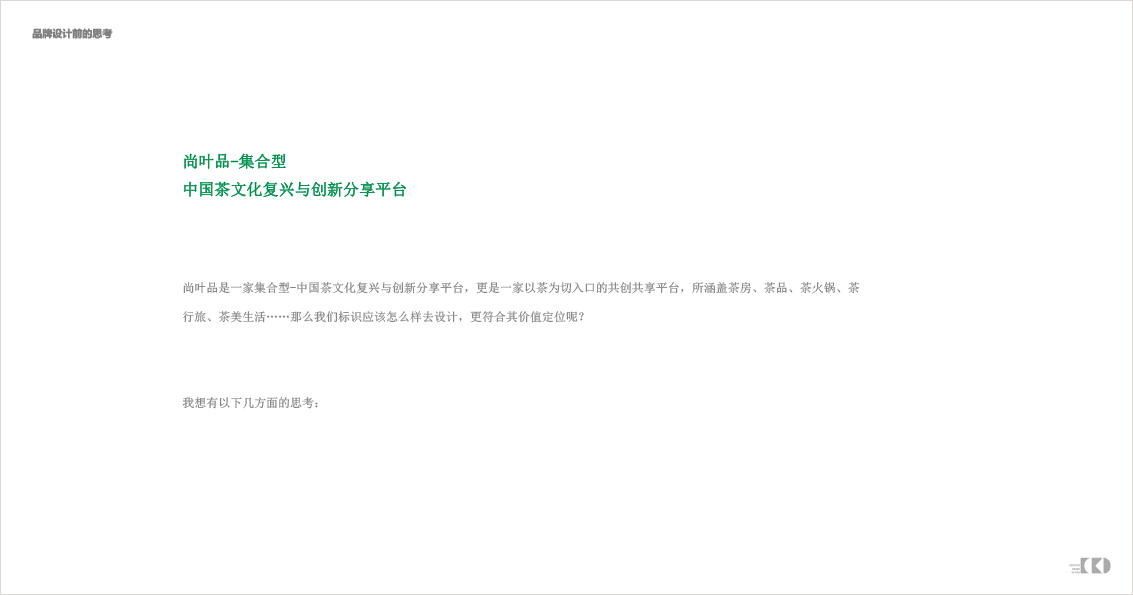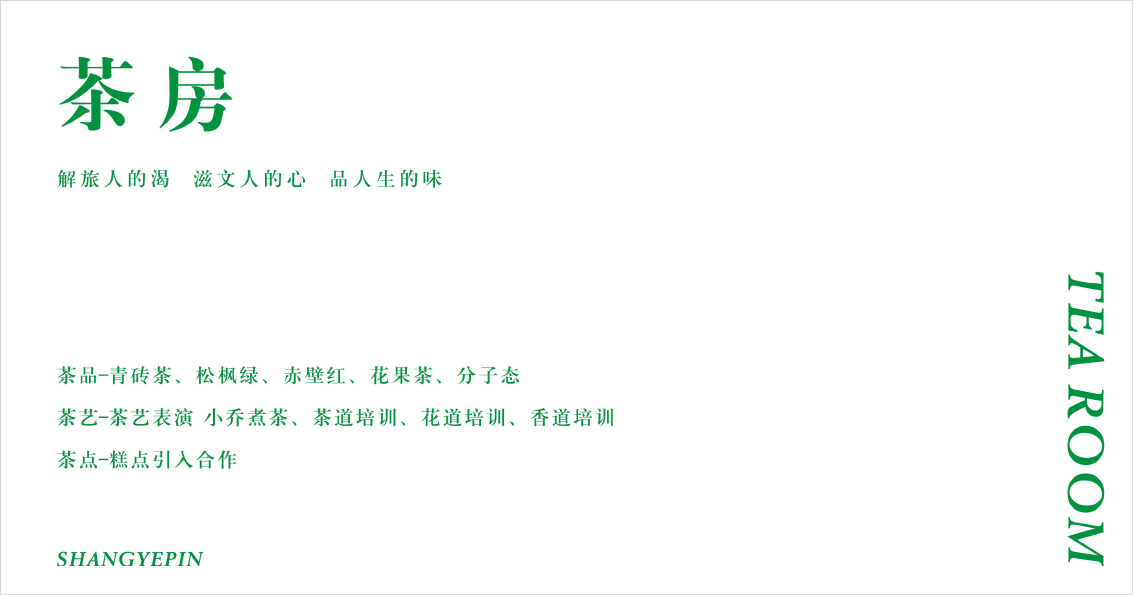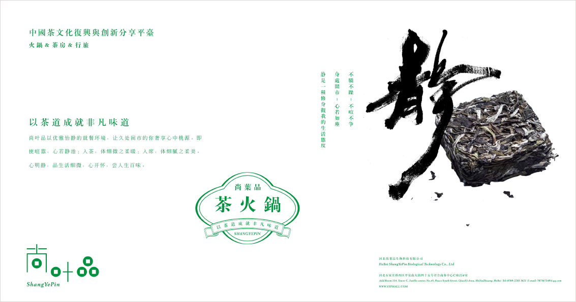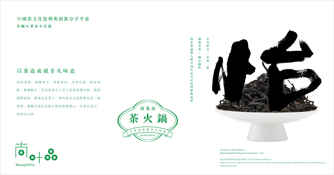 尚叶品是一家集合型-中国茶文化复兴与创新分享平台,更是一家以茶为切入口的共创共享平台,所涵盖茶房、茶品、茶火锅、茶行旅、茶美生活……那么我们标识应该怎么样去设计,更符合其价值定位呢?我想有以下几方面的思考: