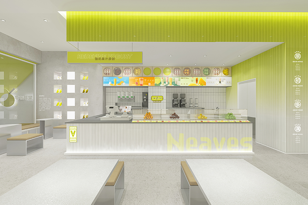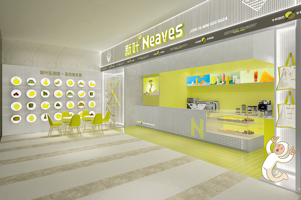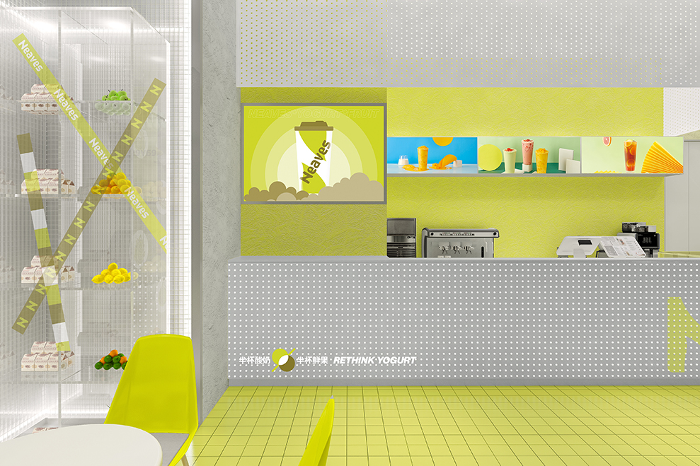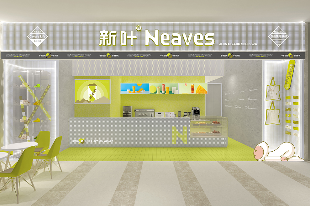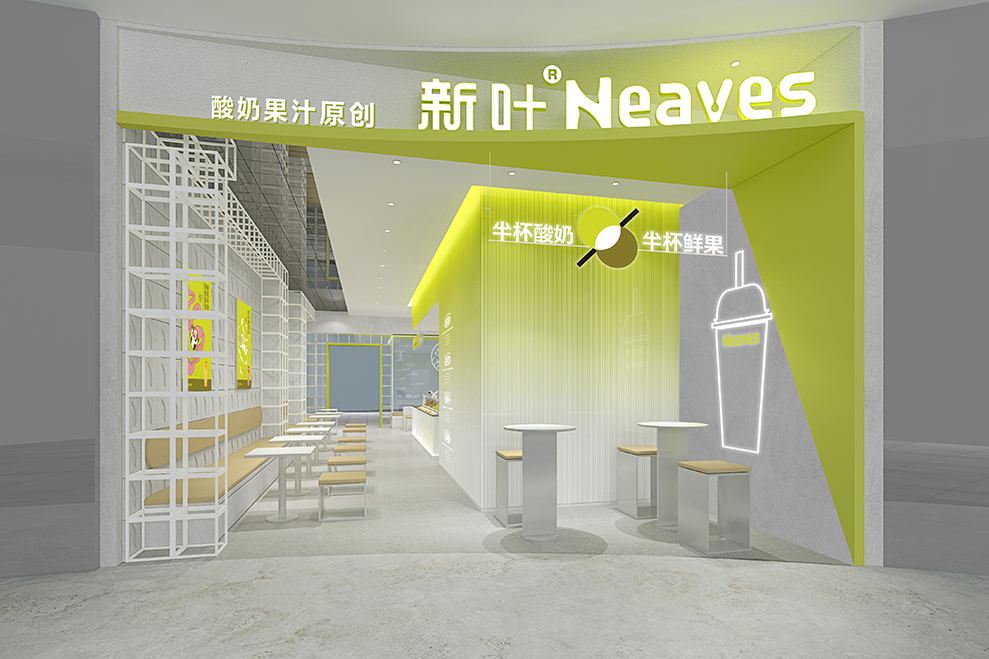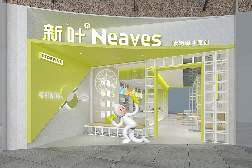 品牌大店的设计,主要以渐变的树脂玻璃为主要材料;辅以订制的水泥方格墙;均以“新绿”为冲击视觉,强强关联住:新叶=新绿色的印象。门头店名:新叶-Neaves;产品定位:酸奶果汁原创;广告语:半杯酸奶%半标酸果,是不可抹灭的元素;以后每个店前都会配一个品牌IP:一边健着身,一边喝着奶茶,以强化新叶酸奶果汁,喝不胖的产品属性。