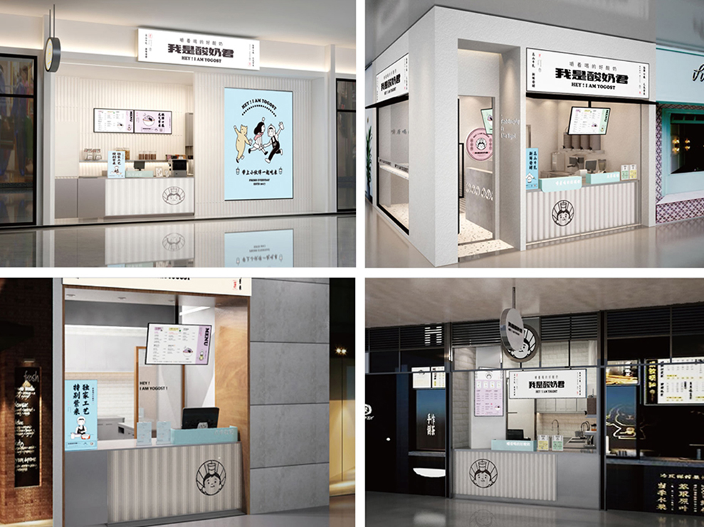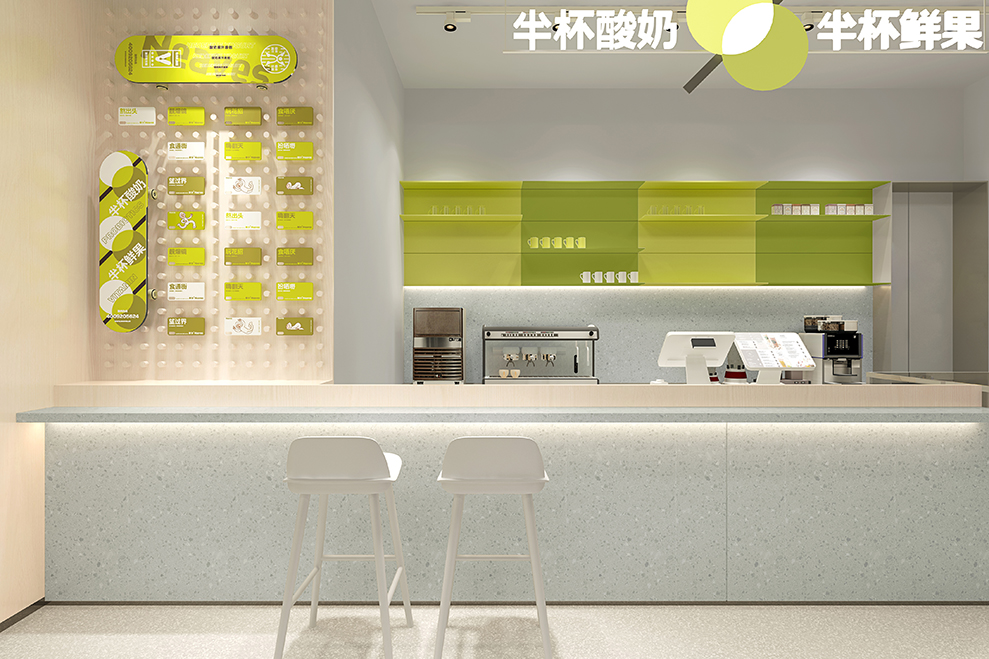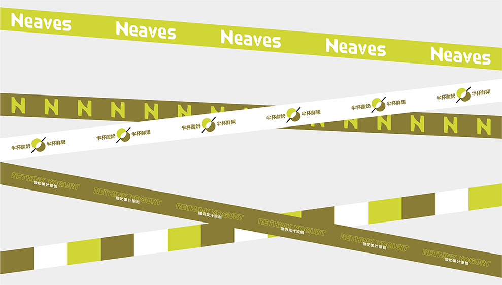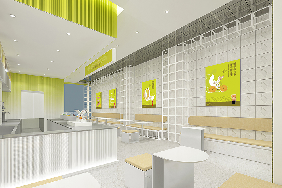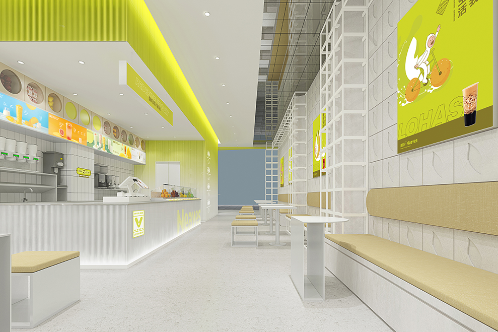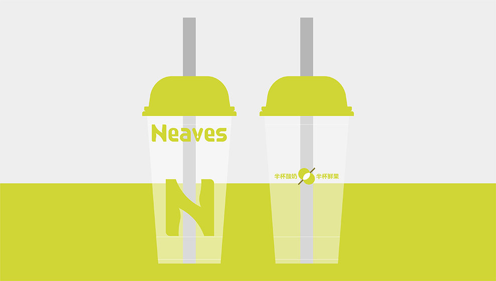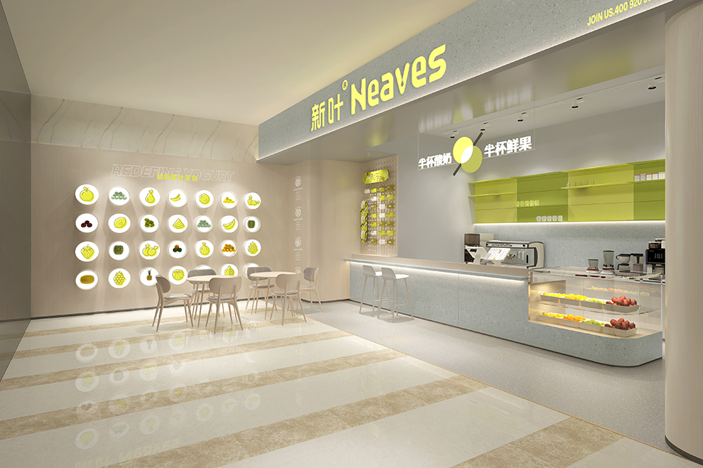 品牌大店的设计,主要以渐变的树脂玻璃为主要材料;辅以订制的水泥方格墙;均以“新绿”为冲击视觉,强强关联住:新叶=新绿色的印象。门头店名:新叶-Neaves;产品定位:酸奶果汁原创;广告语:半杯酸奶%半标酸果,是不可抹灭的元素;以后每个店前都会配一个品牌IP:一边健着身,一边喝着奶茶,以强化新叶酸奶果汁,喝不胖的产品属性。