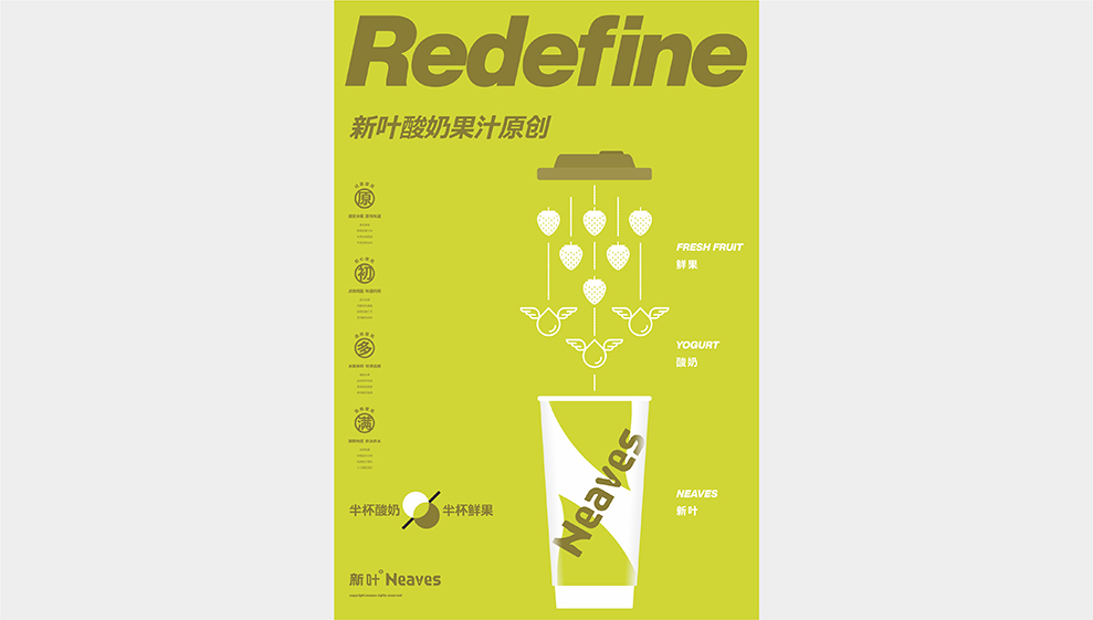 半杯酸奶,半杯鲜果,来自于消费者问卷印象;他们对于产品的认知,认为新叶的产品,杯大量足,购买消费的过程中,看到直接是半杯酸奶、半杯鲜果的制作;非冰非水,也传统的奶茶店不同,这是他们选择购买的原因。所以,我们直接提取食客印象,作为我们的品牌广告语及产品核心USP卖点。