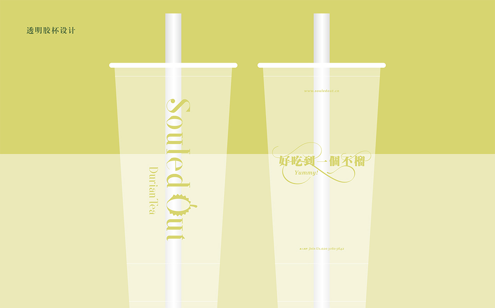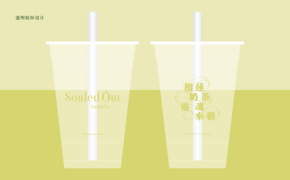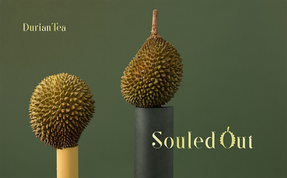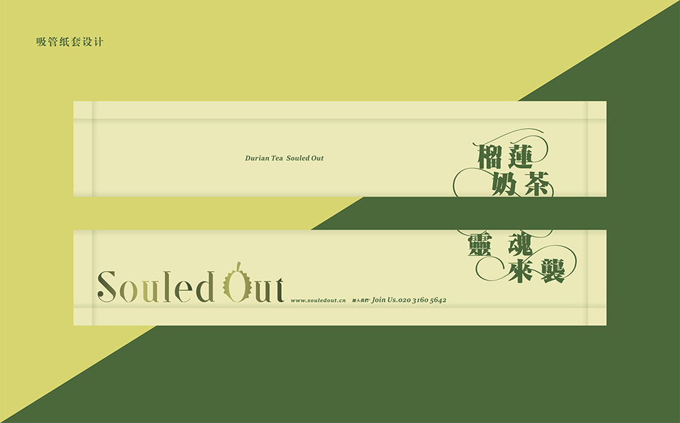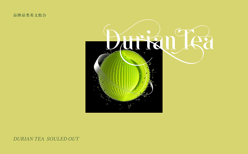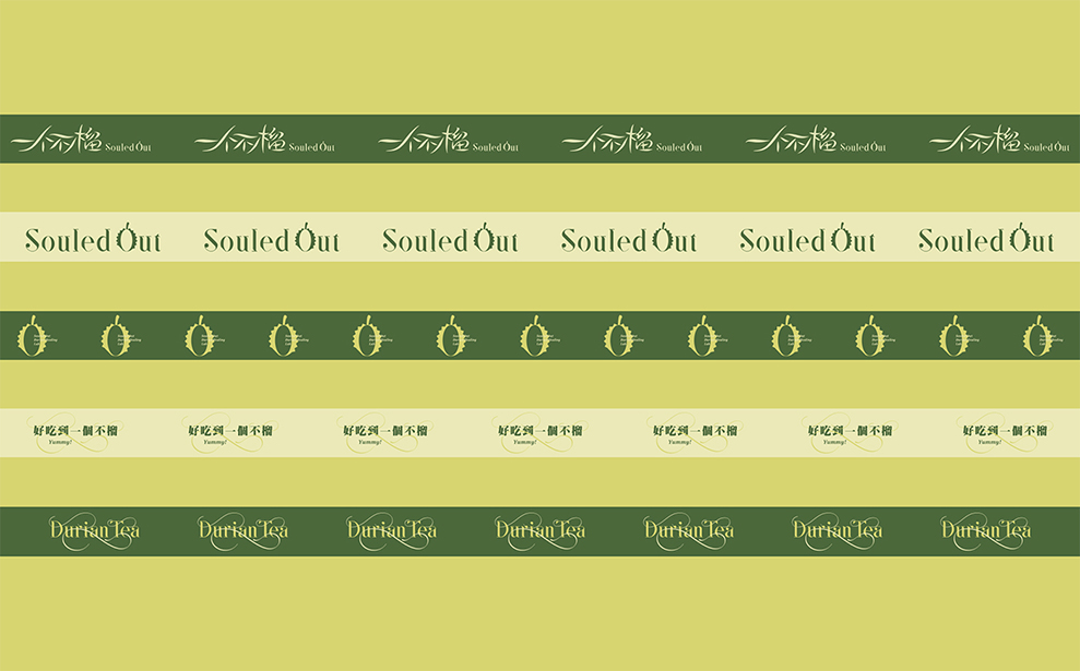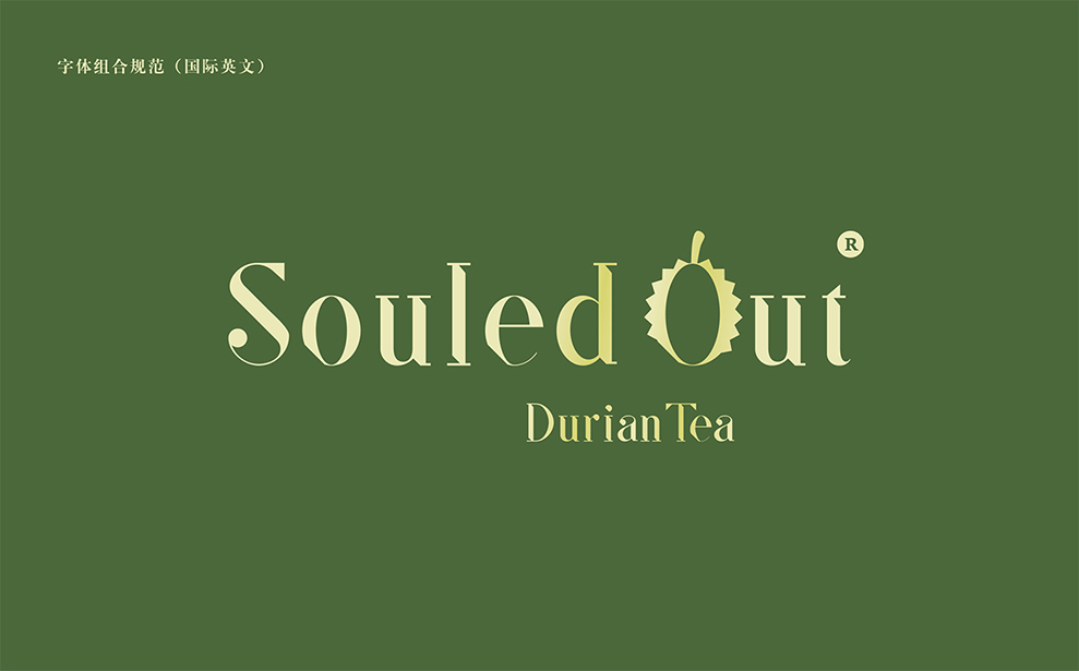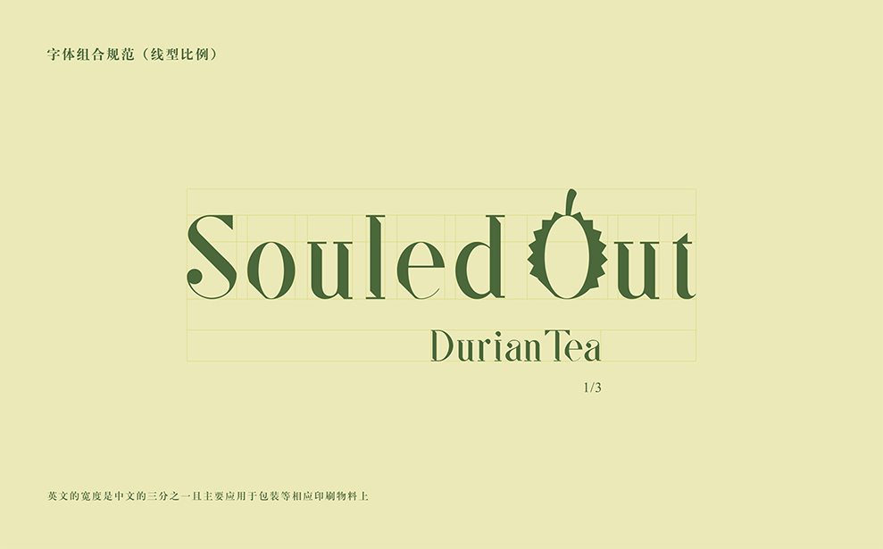 字体组合规范(国际英文)线形比例,下面{Durian Tea}的长度是上面整个{Souled Out}的三分之一,且与上面距离是{Durian Tea}字体的等高间距。所放位置在{Souled Out}二个英文单词空格处中间,起到一个视觉补充的作用。