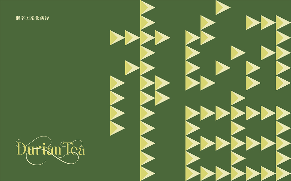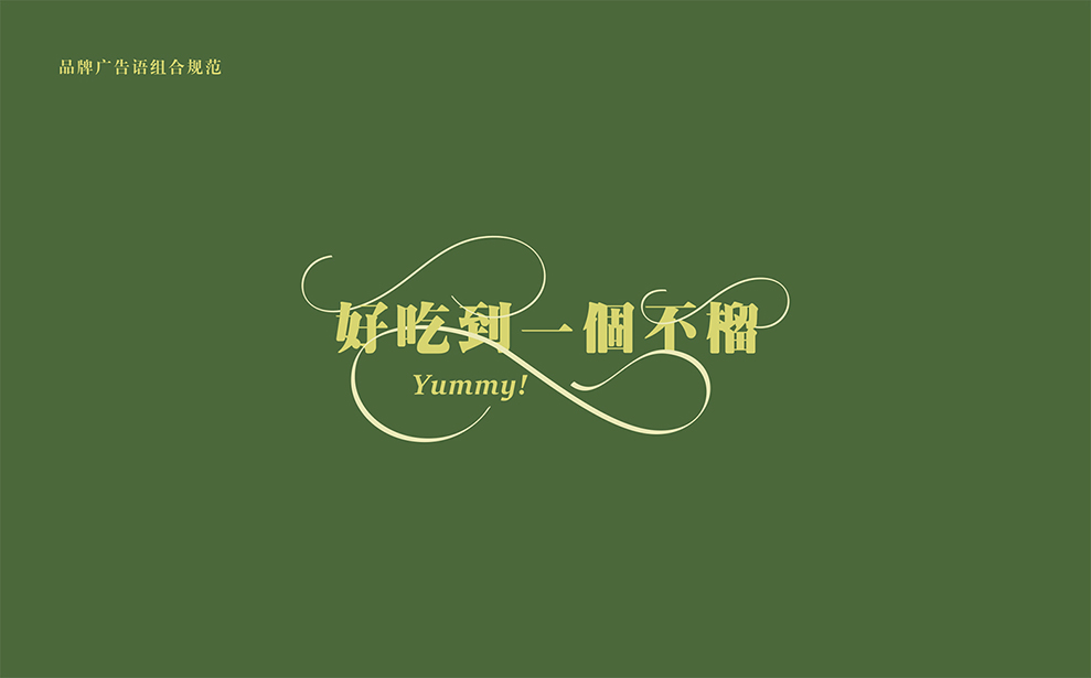 中文{一个不榴}字体的设计邀请专业字体创作家{张泽坚}老师进行绘制,是想表达{榴莲树-树叶}的飘逸感,因为前三个字笔画简单、后一个字笔画复杂,所以绘制上尽量做到了单个字既有识别性,四个字在一起也有整体性。