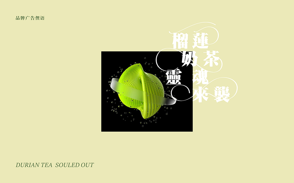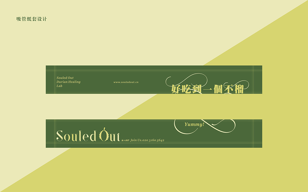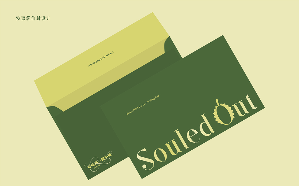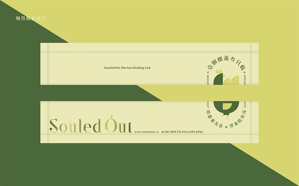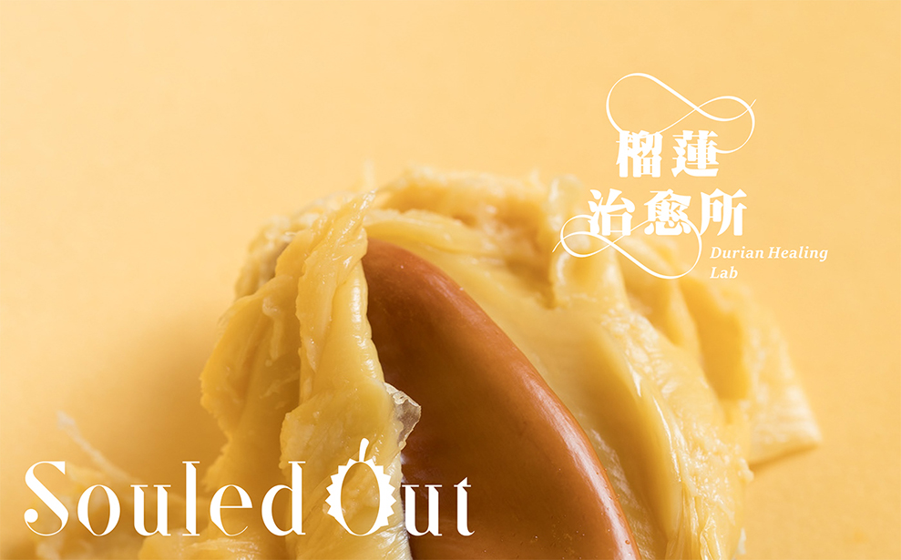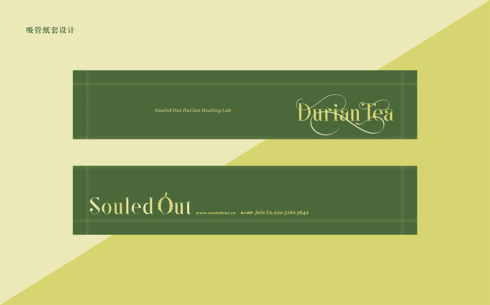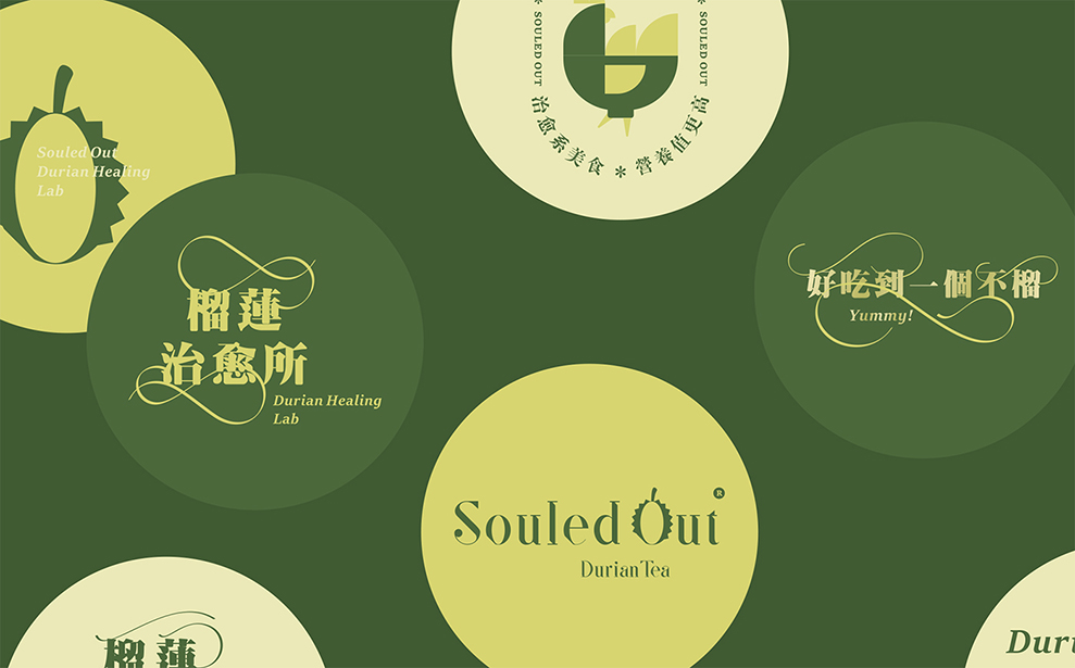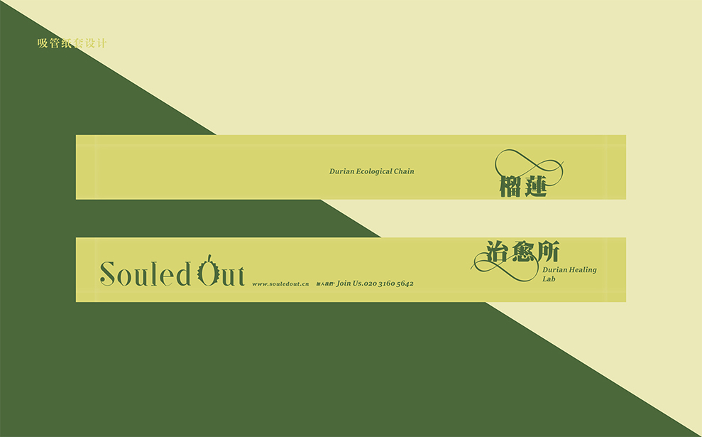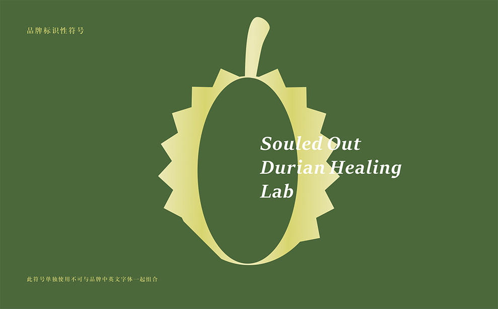 品牌线下空间的定义(英文):Souled Out Durian Healing Lab。我们希望在一些简短的英文,对外进行传播的时候都可以加以规范,形成标准,右下角为Soul灵魂的艺术化装饰。