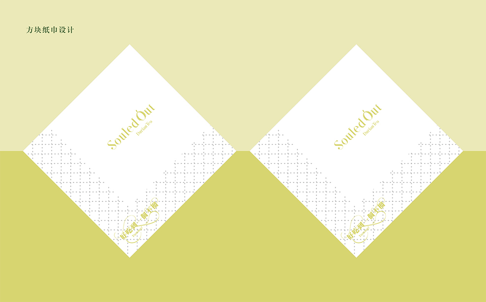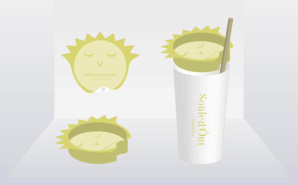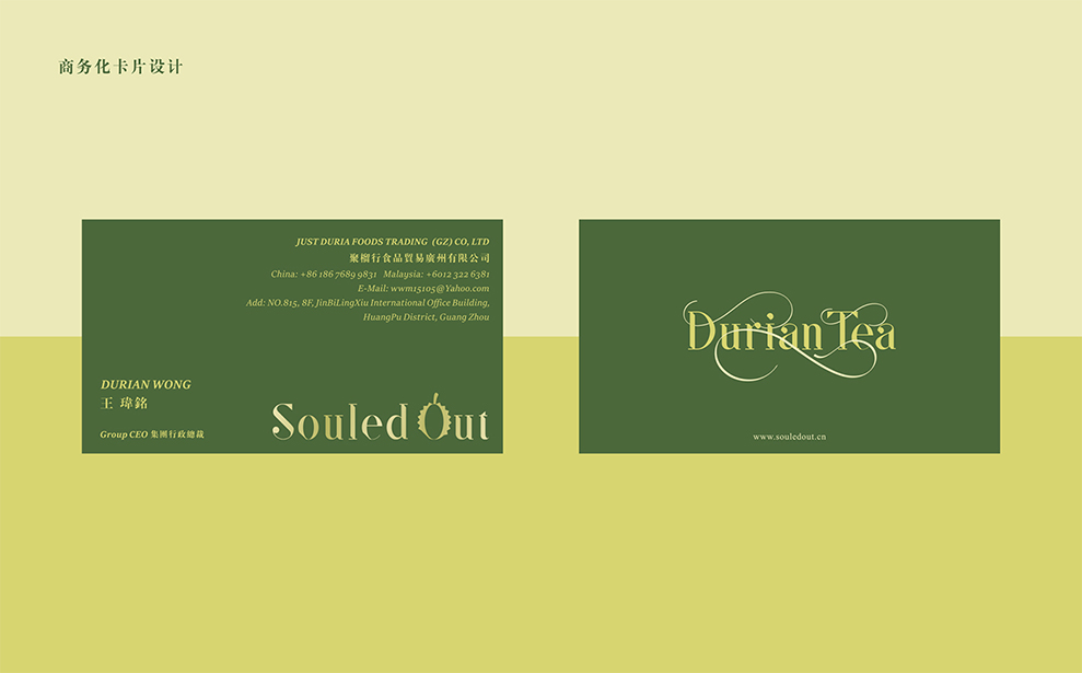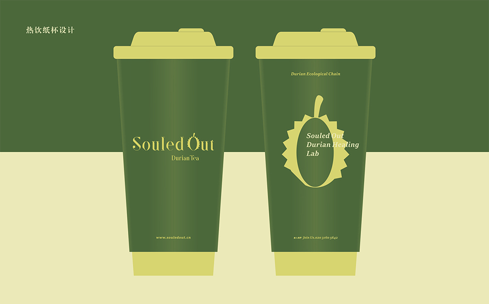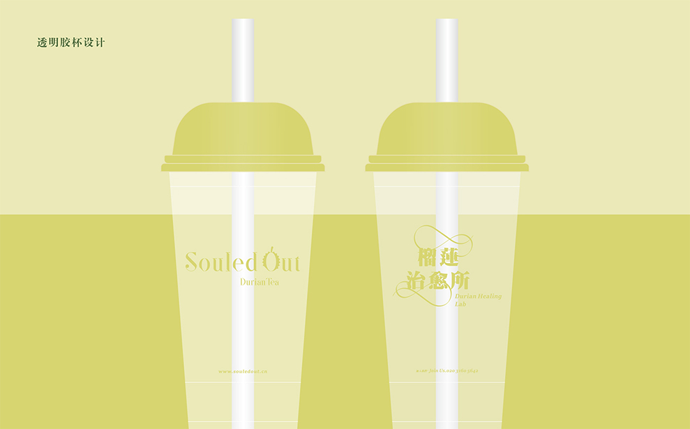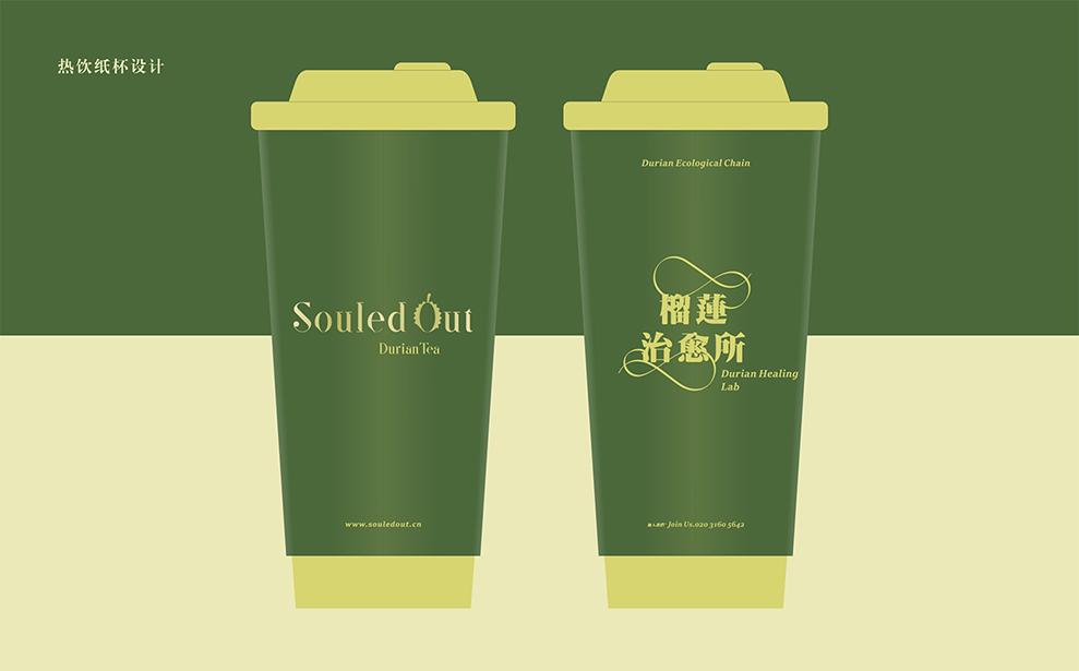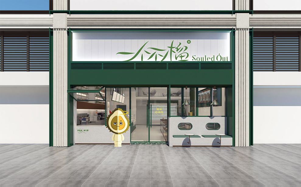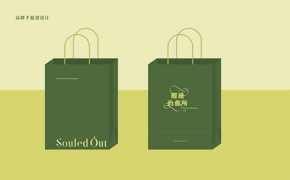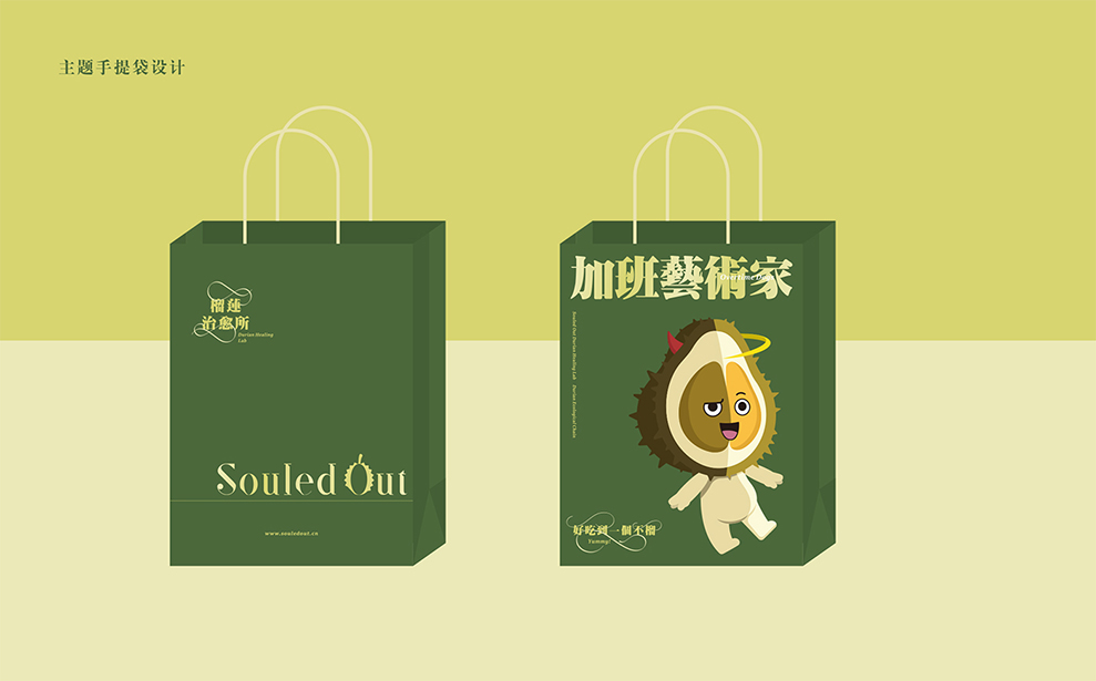 品牌线下空间的定义(英文):Souled Out Durian Healing Lab。我们希望在一些简短的英文,对外进行传播的时候都可以加以规范,形成标准,右下角为Soul灵魂的艺术化装饰。