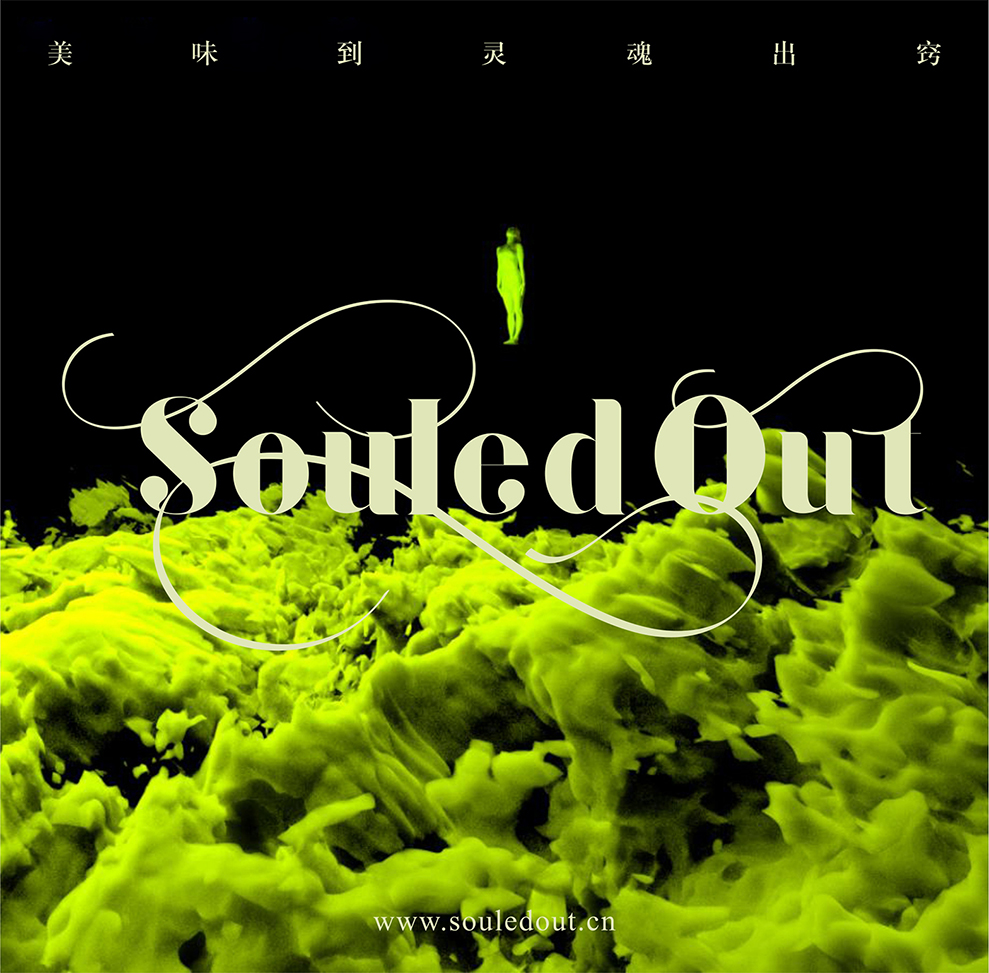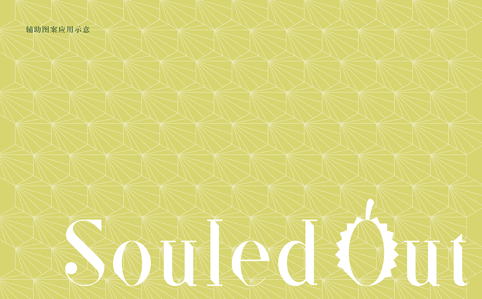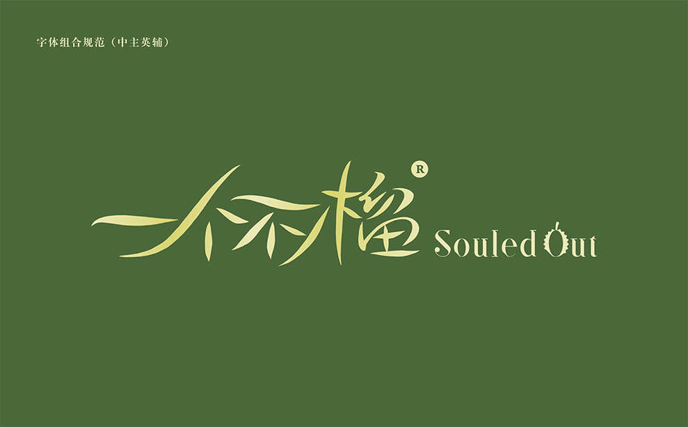 字体组合规范(英主中辅)线形比例,{一个不榴}放置在{Souled Out}二个英文单词空格处中间起视觉补充作用。且该组合应用于双语地方,既能保留英文识别又能保证中文识别。