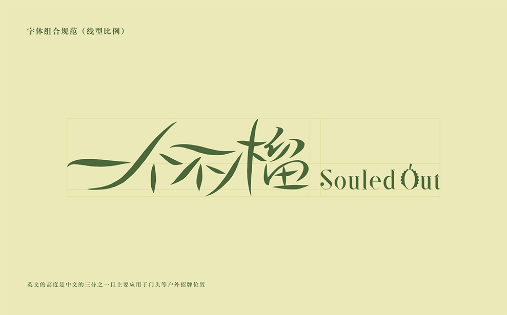 字体组合规范(中主英辅)线形比例,英文{Souled Out}是{一个不榴}的三分之长,且该标准组合更多用于门头户外招牌等大型传播画面中。