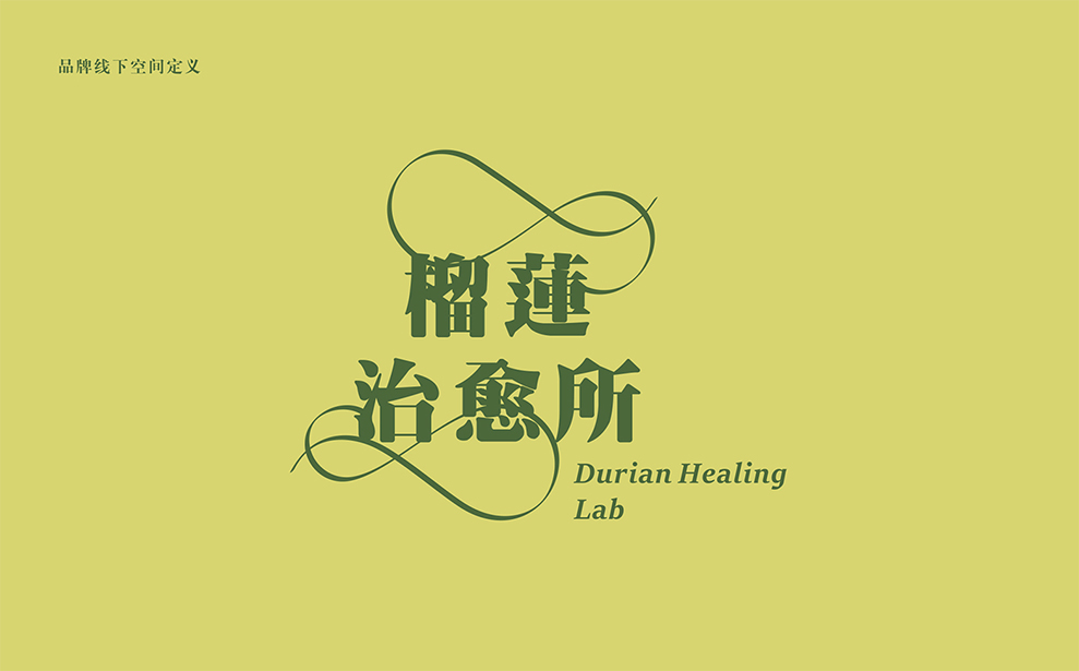 品牌线下空间的定义(中文):榴莲治愈所,为什么是榴莲治愈所?策略阶段讲过,榴莲是热性食品,对活血散寒、修复心情有治愈作用,故命其名为:榴莲治愈所。字体选择以繁体为主,则因来自马来西亚,繁体更具历史感与南洋风。装饰性线条语言,则是这个品牌中最大的亮点,后续的设计都有体现;右下角的英文{Durian Healing Lab}是其翻译,把整个的组合视觉重心落地右下角。