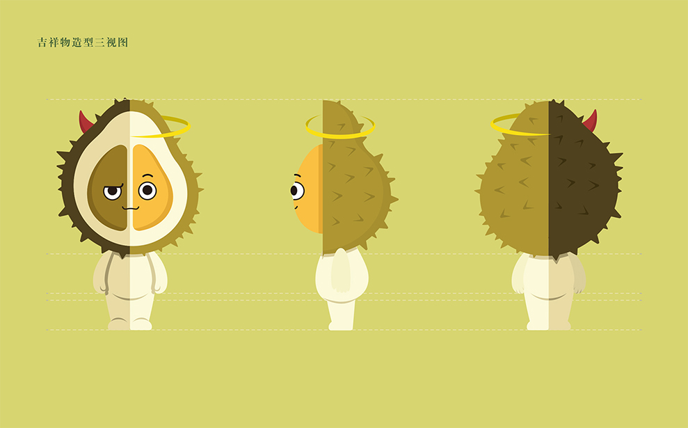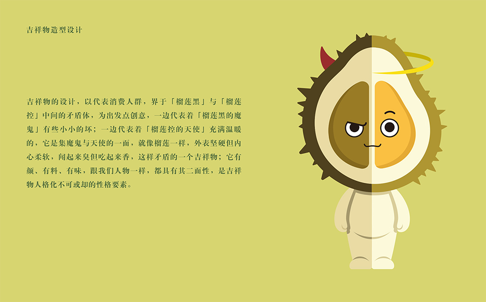 吉祥物的设计,以代表消费人群,界于{榴莲黑}与{榴莲控}中间的矛盾体,为出发点创意,一边代表着{榴莲黑的魔鬼}有些小小的坏;一边代表着{榴莲控的天使}充满温暖的,它是集魔鬼与天使的一面,就像榴莲一样,外表坚硬但内心柔软,闻起来臭但吃起来香,这样矛盾的一个吉祥物;它有颜、有料、有味,跟我们人物一样,都具有其二面性,是吉祥物人格化不可缺的性格要素。