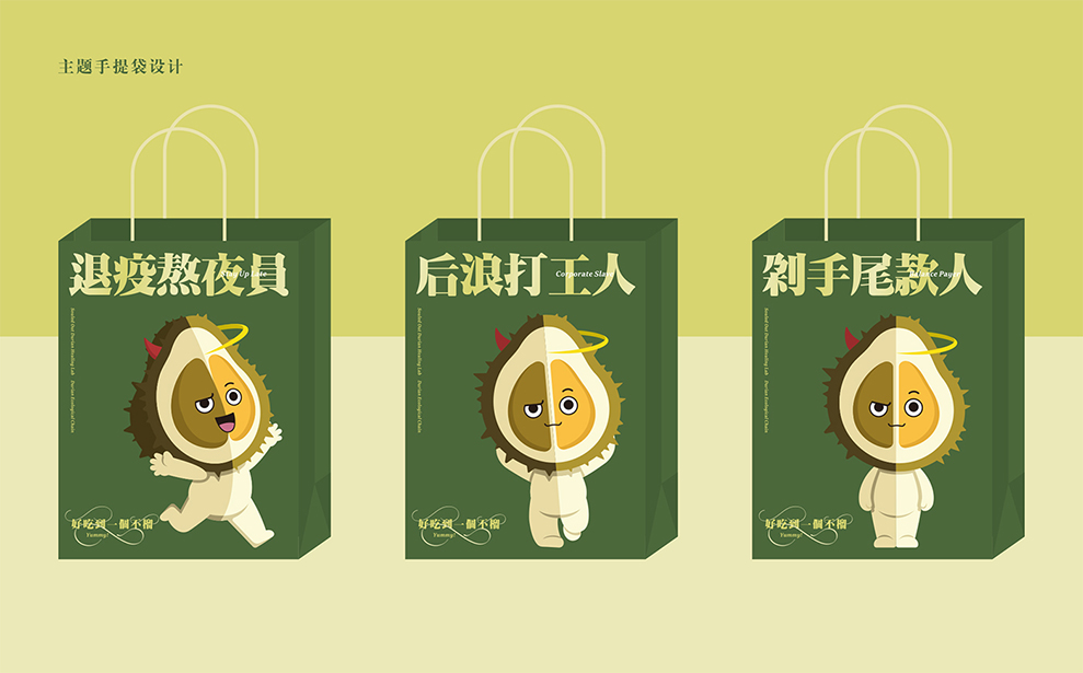 *话题类手提袋设计(加班艺术家+退疫熬夜员+后浪打工人+剁手尾款人)。