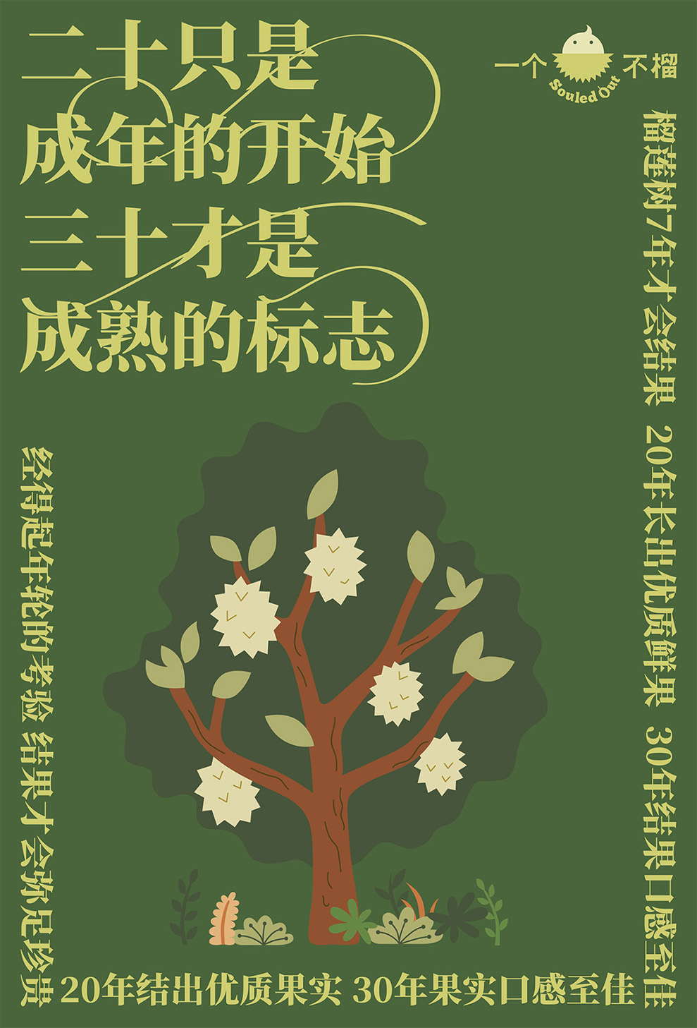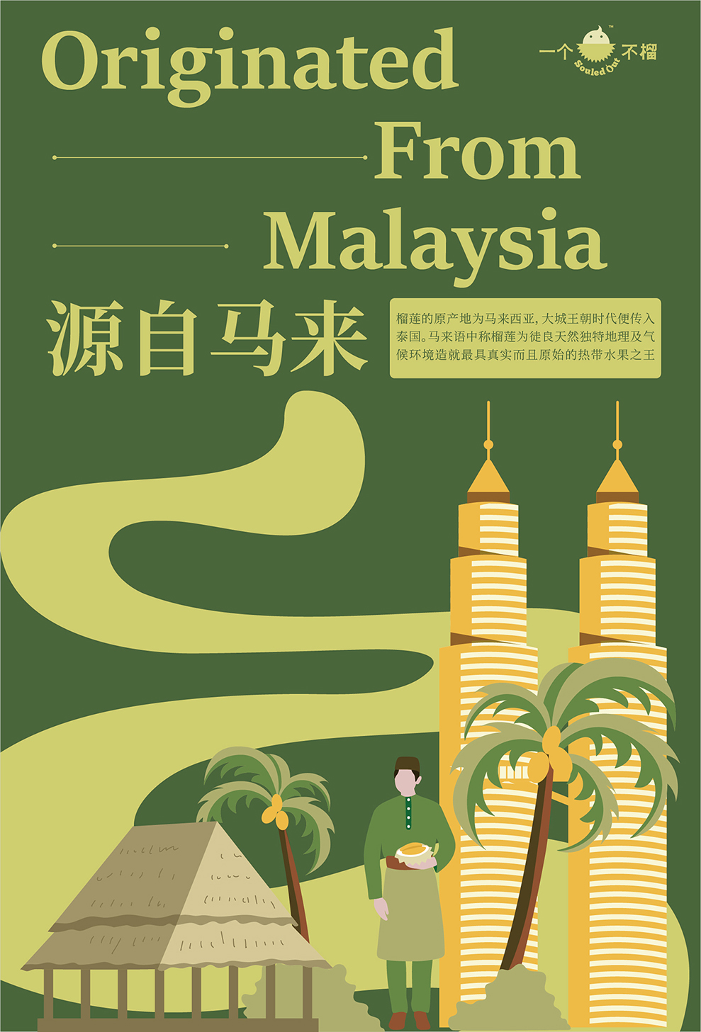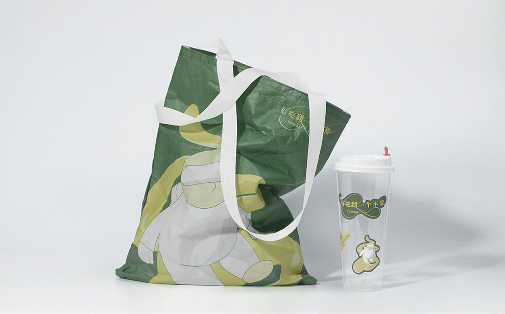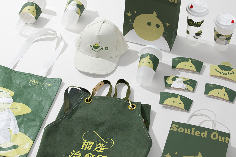 一个不榴使用的是来自马来西亚的进口榴莲,我们特别选择了具有异国风情的复古「马来绿」来定义品牌主色,提取「榴莲黄」来作为品牌辅助色。