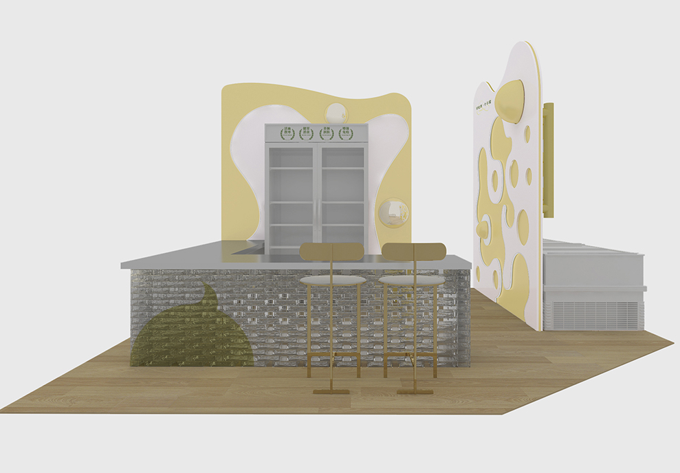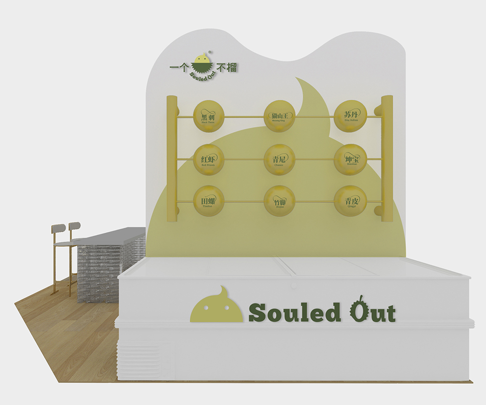 整个展厅为二十平方,利用榴莲的黄色来展开,主要由两块展板分割空间。展板的左面:通过曲线创造图形,配合半球形装置,意为榴莲的气味飘香。展板的右面:一个大大的榴莲造型装置,里面装满大大小小的不锈钢球体,凸显出一个不榴的榴莲出品果肉饱满。