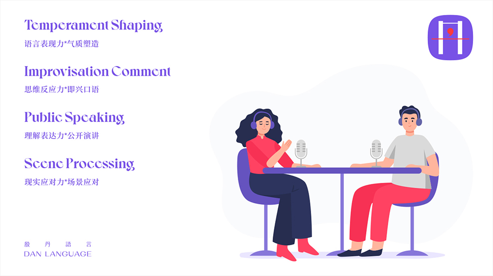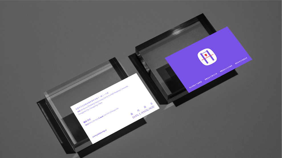 标志的设计源自对“丹”的图形化设计,拒绝从传统播音、主持、话筒等行业元素出发,二横二竖构架起整个丹的结构,中间一点则采用:逗号“,”,表达着更多的可能,未完续的状态,外型采用当下比较炙热的“小米框”,使之图标整体性更强,品牌颜色采用紫蓝色为主,辅以点缀的红色,高雅而具有活力。