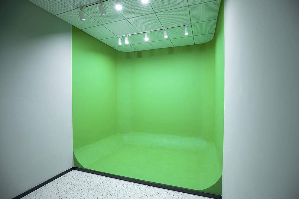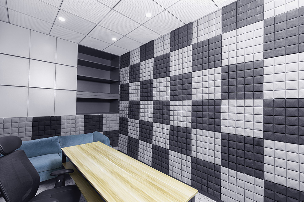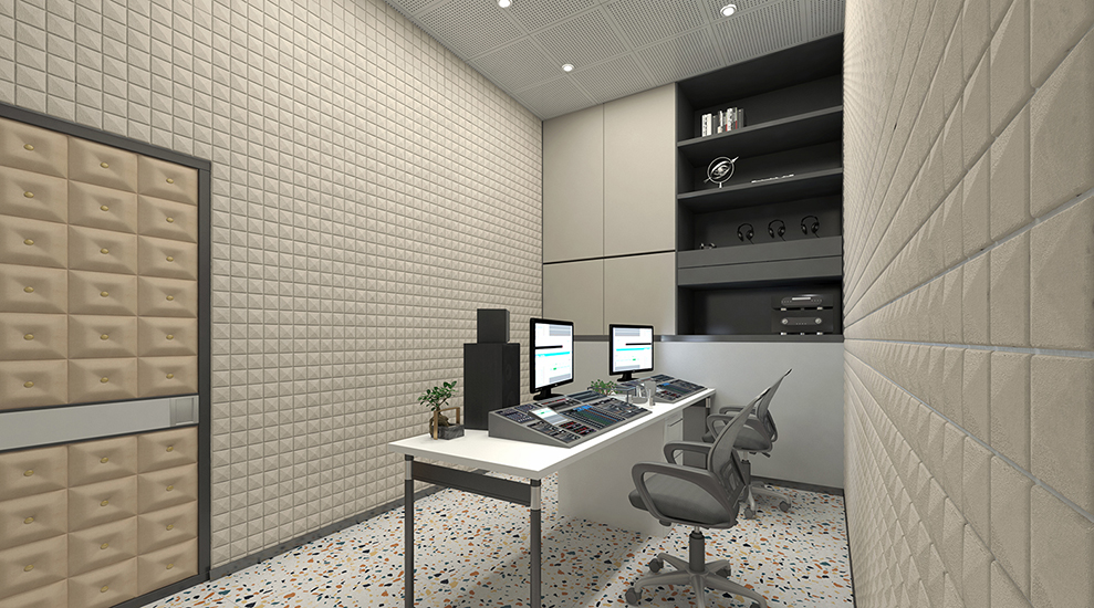 源自录音室对隔音的要求,墙面均采用隔音板,表面再附一层吸音棉,天花采用矿棉板吊顶,减少外界噪音的传播。