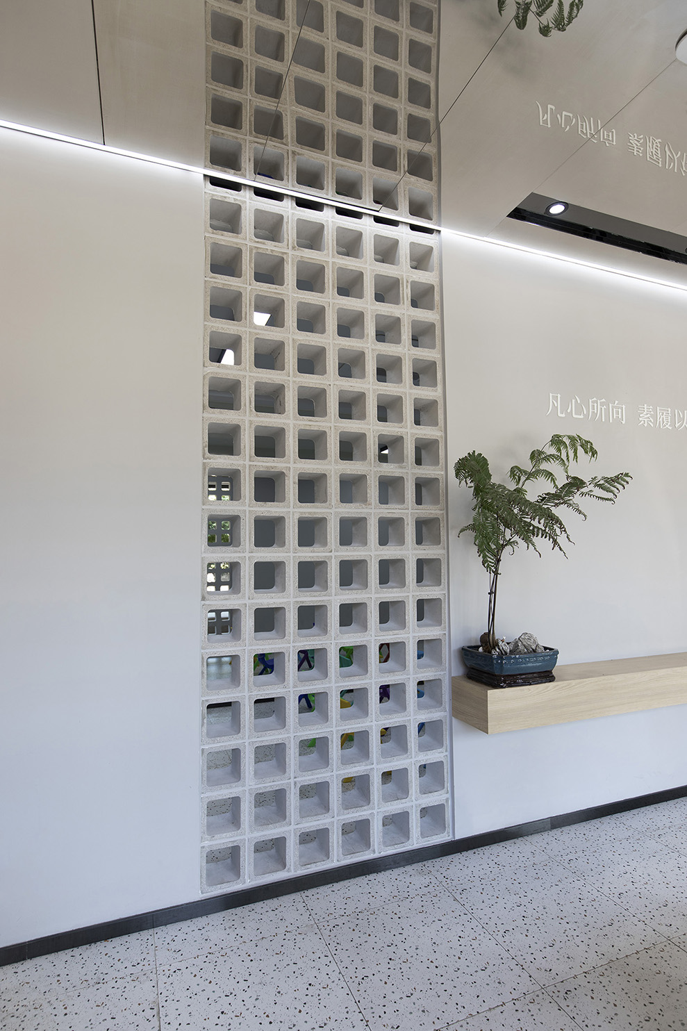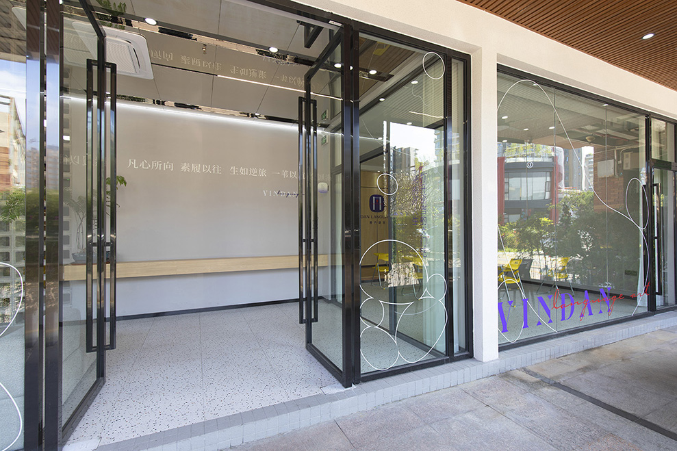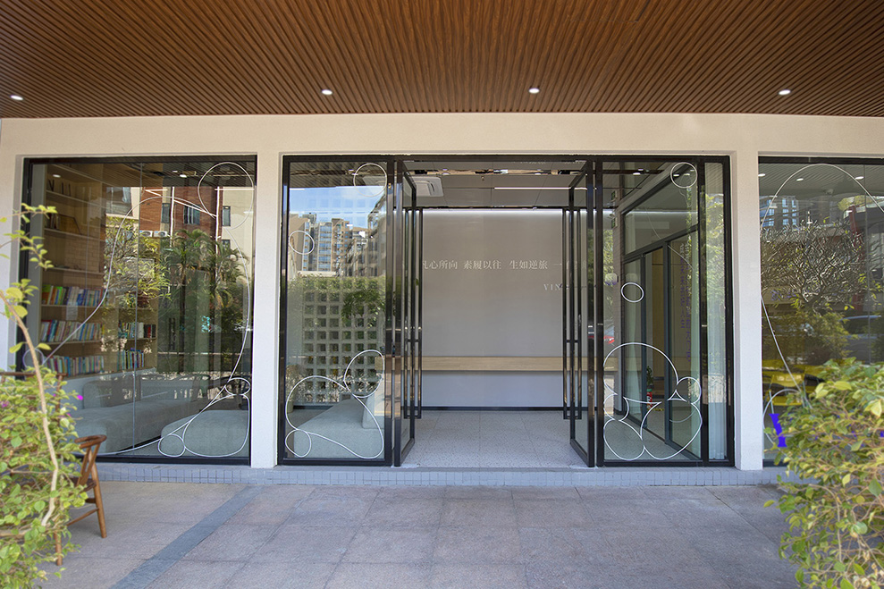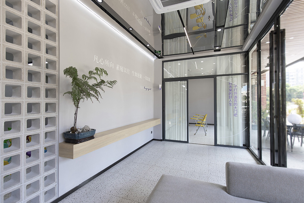 水泥空心砖,做到内部教室与外部的连接,中间马醉木绿植点活整个空间,背景墙上"凡心所向,素履以往;生如逆旅,一苇以航",表达出品牌的人生哲学,苇航二字便出自此处。